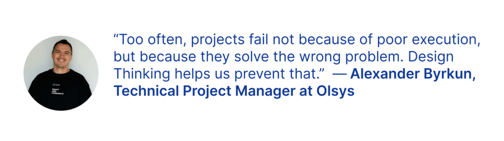 In outsourcing, challenges like distance, cultural differences, and evolving requirements can create misalignment. By applying Design Thinking, Olsys ensures: